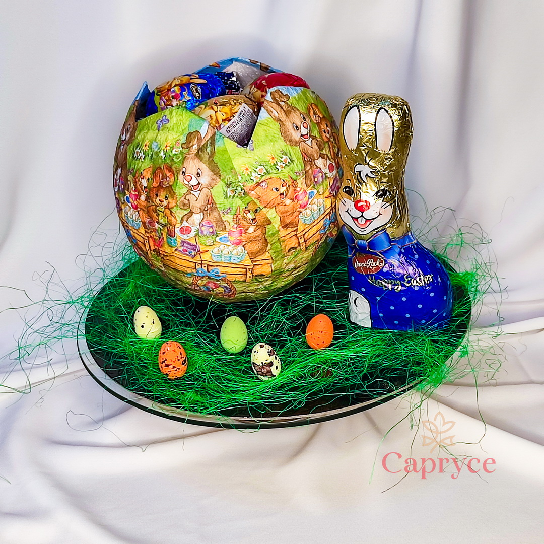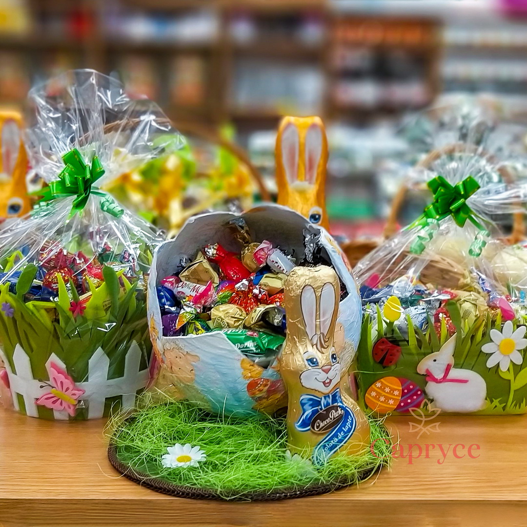Aranjamente inedite cu tematica de Paște, umplute cu dulciuri, decoratiuni sau mesaje și obiecte personalizate.